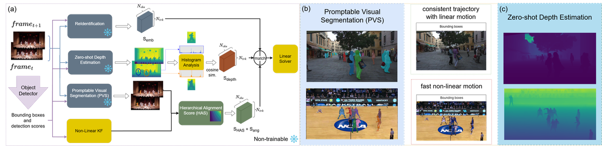 TL;DR: DepthMOT is a cutting-edge multiple object tracking framework that enhances object association by integrating monocular depth estimation—used in a zero-shot, training-free manner—as a standalone feature. It introduces a Hierarchical Alignment Score that combines coarse bounding box overlap with fine-grained pixel-level alignment for more accurate tracking, especially in scenes with occlusion or similar-looking objects. DepthMOT achieves state-of-the-art results on challenging benchmarks without any training or fine-tuning.